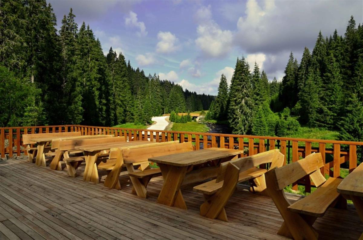 Velká terasa je chloubou Pivovaru Lyer. Při pěkném počasí si tak můžete vychutnat naše domácí pivo a pochoutky české kuchyně s překrásným výhledem na Roklanský potok.